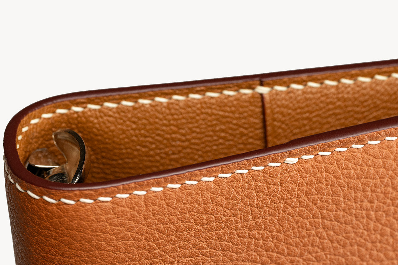 斜めのステッチや滑らかな縁は、RITSNOこだわりの一つです。さらに、負荷がかかりやすい部分には返し縫いを施して耐久性を向上させており、正面に見える二重のステッチはこれによるものです。