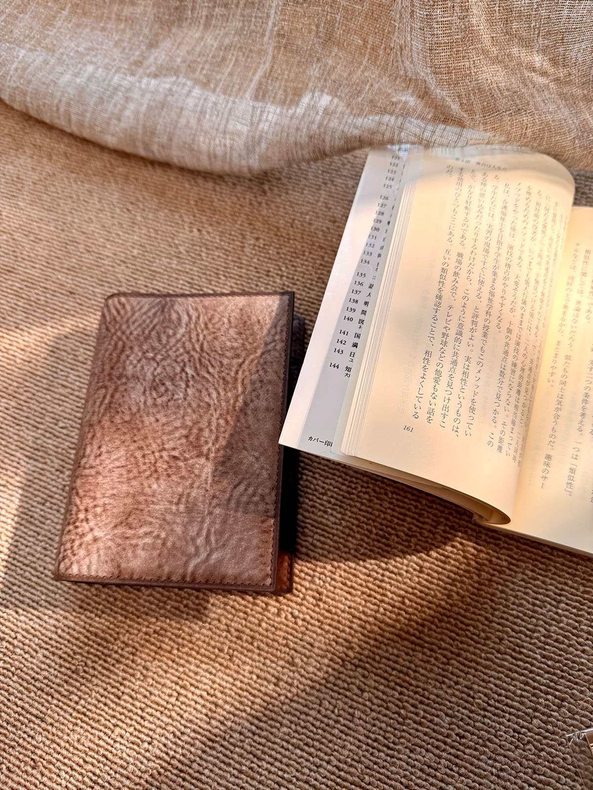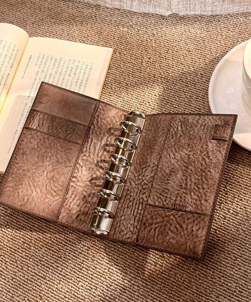 ロゴは銀箔から焼印へ。手帳の外縁に塗られたワックスには特別な加工を施し、白いワックスを取り除くことで、輪郭を際立たせる視覚効果を生み出す。これら全てがRITSNOの独自の美学を体現しています。製品の縁部分に見られる薄い線「捻(ネン)」は通常モデルよりも太めに。落ち着いた雰囲気がより一層強調されています。